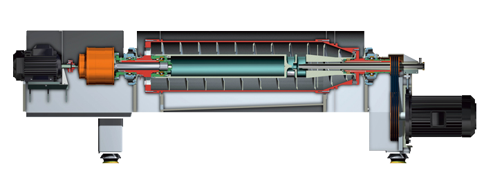 Alfa Laval Prodec dekanter sentrifuqaları lil və ya şlamları bərk fazaya və bir və ya iki maye fazaya ayırmaq üçün xüsusi olaraq hazırlanmışdır. Ayırma sürüşmə konveyerlə təchiz olunmuş üfüqi silindrik qabda baş verir. Məhsul stasionar giriş borusu vasitəsilə qaba verilir və sonra tam axınlı qidalanma zonası dizaynında rəvan sürətləndirilir. Mərkəzdənqaçma qüvvəsi (3500 G-ə qədər) bərk maddələri qabın daxili səthinə çökdürür. Konveyer qabla eyni istiqamətdə fırlanır, lakin bərk maddələri qabın konusvari ucuna doğru hərəkət etdirmək üçün fərqli sürətlə fırlanır. Qatı cisimlər qabı bərk maddələrin boşaldılması delikləri vasitəsilə korpusa buraxır. Ayırma qabın silindrik hissəsinin bütün uzunluğu boyunca baş verir və təmizlənmiş maye tənzimlənən boşqab bəndləri üzərindən korpusa axaraq qabı tərk edir.